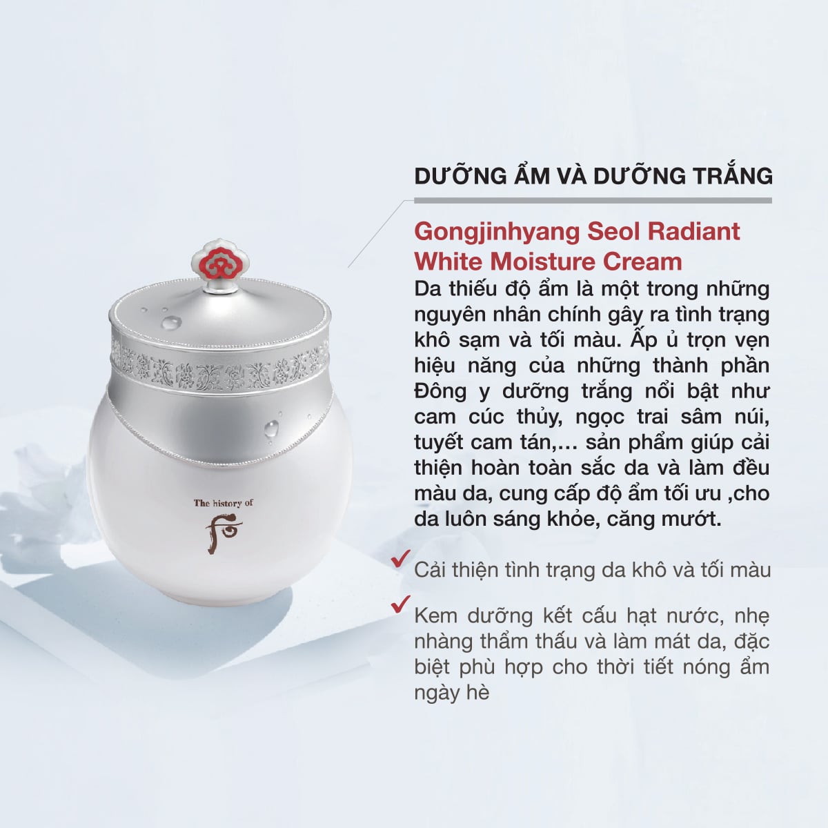 Kem dưỡng trắng với các thành phần Đông y như Ngọc trai sâm núi, Cam cúc, Tuyết cam tán.. là sự kết hợp hoàn hảo công thức làm trắng cùng hiệu quả dưỡng ẩm đột phá mang lại làn da trắng trong và mọng nước.