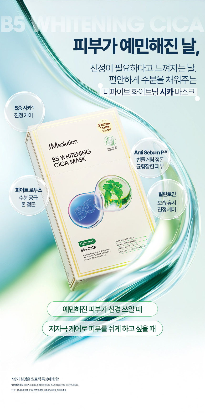 Mặt nạ JM Solution B5 Whitening Cica Mask (dung tích 25ml) là phiên bản chuyên biệt kết hợp giữa khả năng dưỡng sáng của dòng Whitening và đặc tính làm dịu, phục hồi mạnh mẽ của Rau má (Cica). Đây là lựa chọn lý tưởng cho làn da đang bị kích ứng, mẩn đỏ hoặc da nhạy cảm cần dưỡng trắng nhẹ nhàng.